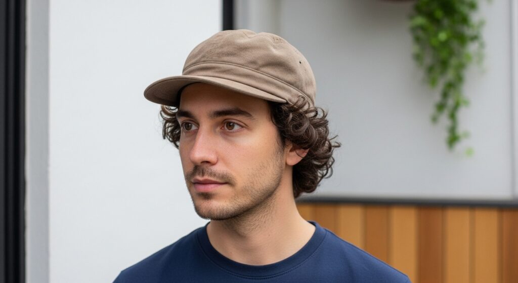Tシャツのような薄手のカットソー素材なら、夏場でも暑くないでしょう。ただし、キャップで天パを抑えていると、取ったときに変なクセが付くので、ずっと被りっぱなしでいられる日にしてください。